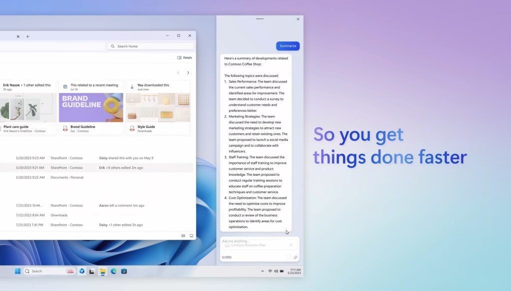 Windows Copilot จะไปใช้งานร่วมกับ Windows 11 ทำให้กลายเป็นระบบปฏิบัติการคอมพิวเตอร์รุ่นแรกที่มี AI มาช่วยในการใช้งาน โดยยังคงความสามารถในการตอบคำถาม ช่วยสรุปงานเอกสารต่างๆ เหมือน ChatGPT หรือ Bing แต่นอกจากนี้ยังสามารถถามและสั่งงานเกี่ยวกับการควบคุม การตั้งค่า Windows 11 ได้ง่ายขึ้นผ่านทาง Windows Copilot ได้เลย รวมถึงสั่งในการช่วยสรุปเอกสาร หรือปรับแก้ไขเอกสารแล้วแชร์ส่งผ่าน Teams ได้ด้วย