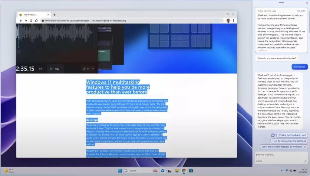 แต่ที่พิเศษกว่าคือ Copilot สามารถทำงานร่วมกับแอปอื่นๆ บนระบบ Windows 11 ได้อย่างดี ไม่ว่าจะเป็นสอบถามการตั้งค่าต่างๆ ของระบบ, ให้ช่วยสรุปข้อมูลจากไฟล์ PDF, อยากฟังเพลงสไตล์ไหนก็บอกได้ จะไปเปิดผ่าน Spotify ให้, ให้ AI ช่วยส่งไฟล์เข้าห้องแชทในแอป Teams และอื่นๆ อีก