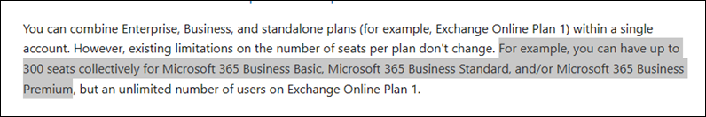สามารถรวมแผน Enterprise, Business และแบบสแตนด์อโลนได้ (เช่น Exchange Online Plan 1) ภายใน Tenant เดียวกัน อย่างไรก็ตาม ข้อจำกัดที่มีอยู่เกี่ยวกับจำนวน Seats per plan ตัวอย่างเช่น คุณสามารถมี Microsoft 365 Business Basic, Microsoft 365 Business Standard และMicrosoft 365 Business Premium รวมกันได้สูงสุด 300 ที่นั่ง แต่ไม่จำกัดจำนวนผู้ใช้ใน Exchange Online Plan 1