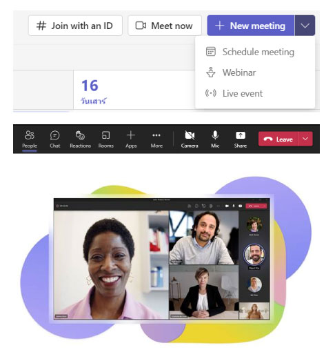 การประชุมผ่านวีดีโอถือเป็นหัวใจสำคัญของซอฟต์แวร์ Collaborative ที่ช่วยให้การประชุมมีประสิทธิภาพมากที่สุด ดังนั้น Teams จึงเสนอฟีเจอร์ที่ตอบโจทย์การใช้งานได้ในหลายมิติ ทั้งการสร้างการนัดหมายในการประชุม Meet now, Schedule meeting, Webinar และ Live event