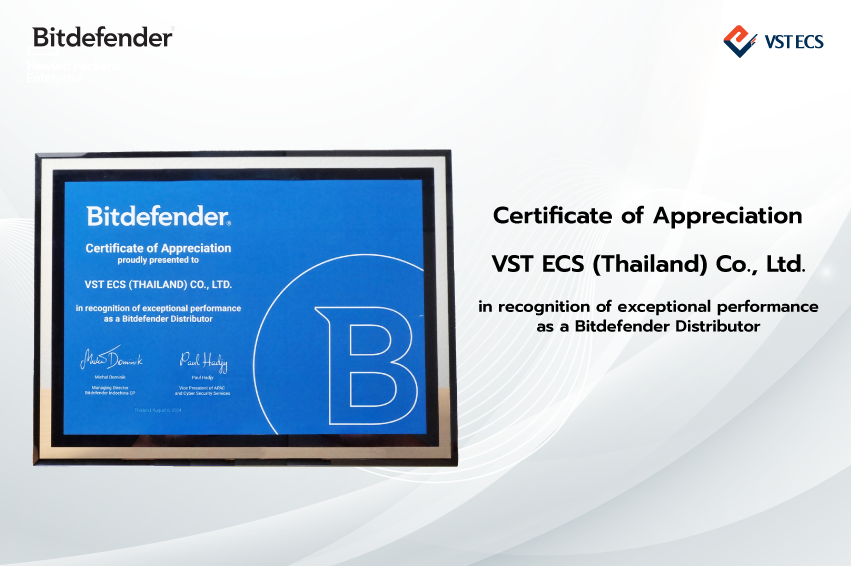 บริษัท วีเอสที อีซีเอส (ประเทศไทย) จำกัด ในเครือของวีเอสที อีซีเอส กรุ๊ป ผู้นำด้านการจัดจำหน่ายสินค้าไอทีในภูมิภาคเอเชียแปซิฟิก รับมอบประกาศนียบัตร Certificate of Appreciation จาก Mr. Paul Hadjy รองประธานภูมิภาคเอเชียแปซิฟิกและการบริการความมั่นคงปลอดภัยทางไซเบอร์ และ Mr. Michal Dominik กรรมการผู้จัดการ Indochina Country Partner บริษัท Bitdefender ผู้นำด้านความมั่นคงปลอดภัยทางไซเบอร์ระดับโลก ในงาน Bitdefender Cybersecurity Forum: “Fortifying Data and Business Environments” จัดขึ้น ณ โรงแรม เอส 31 สุขุมวิท กรุงเทพมหานคร โดยนับเป็นรางวัลแห่งความภาคภูมิใจของทีมงานวีเอสที อีซีเอส (ประเทศไทย) จากผลการดำเนินงานด้านการขายการตลาดและการจัดจำหน่ายผลิตภัณฑ์ที่โดดเด่นตลอดปี 2566