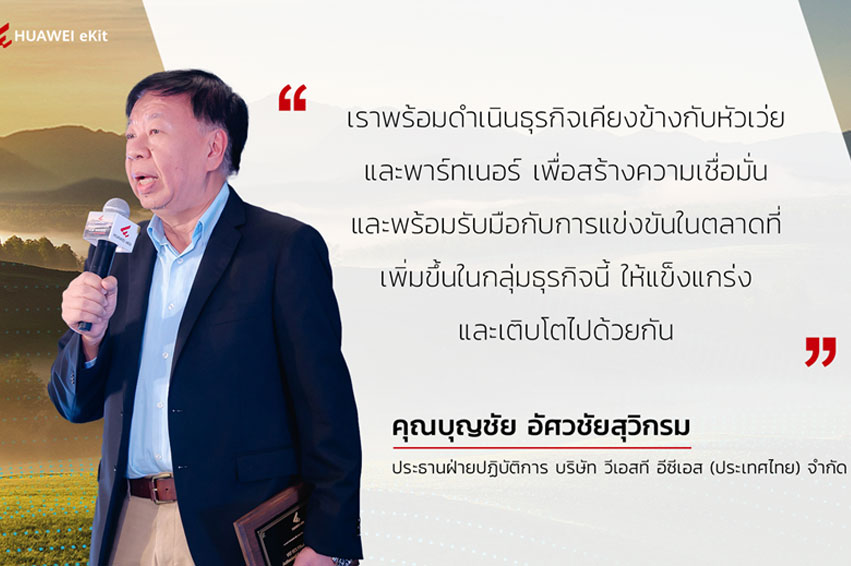 นายเควิน เฉิง ประธานกลุ่มธุรกิจเอ็นเตอร์ไพรส์ บริษัท หัวเว่ย เทคโนโลยี่ (ประเทศไทย) จำกัด กล่าวว่า “หัวเว่ยดำเนินธุรกิจในประเทศไทยมากว่ 24 ปี และได้นำความเชี่ยวชาญทางเทคโนโลยีสารสนเทศและการสื่อสารเข้ามาสนับสนุนการเปลี่ยนผ่านดิจิทัลในหลากหลายอุตสาหกรรม ซึ่งปัจจุบันไทยมีสัดส่วนของธุรกิจเอสเอ็มอีมากกว่า 3 ล้านรายและยังเป็นกลุ่มที่มีบทบาทสำคัญในการขับเคลื่อนเศรษฐกิจและสังคมในภาพรวม ซึ่งภายใต้ความเปลี่ยนแปลงดิจิทัล ธุรกิจเอสเอ็มอี จำนวนมากได้หันมาใช้เทคโนโลยีดิจิทัลเพื่อเพิ่มประสิทธิภาพและยกระดับนวัตกรรมให้กับธุรกิจ สำหรับแนวทางการดำเนินงานของ HUAWEI eKit จะนำเสนอผลิตภัณฑ์, โซลูชันและแพลตฟอร์มที่เหมาะกับการทำตลาดในกลุ่มเอสเอ็มอีโดยเฉพาะเพื่อสนับสนุนการขยายตัวของธุรกิจและจับโอกาสใหม่ในยุคดิจิทัล”