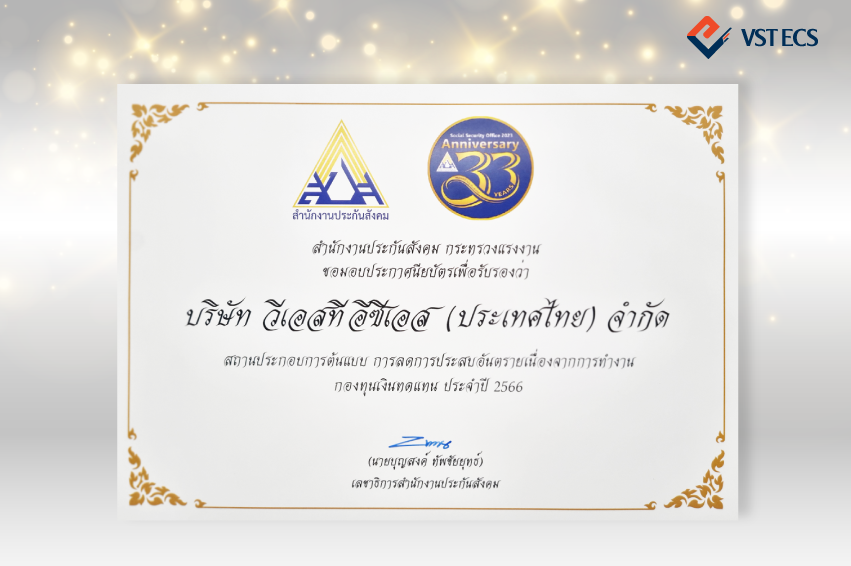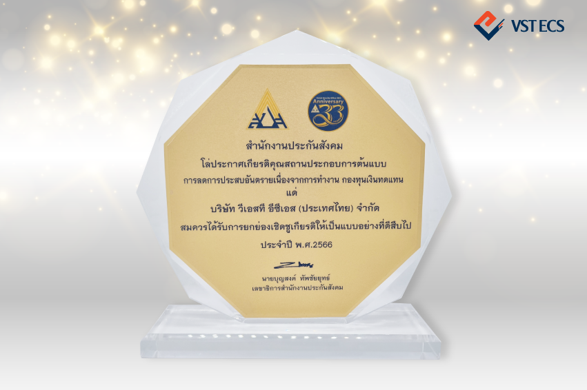 วีเอสที อีซีเอส (ประเทศไทย) รับมอบโล่ประกาศเกียรติคุณสถานประกอบการต้นแบบการลดการประสบอันตรายเนื่องจากการทำงาน กองทุนเงินทดแทน สำนักงานประกันสังคม