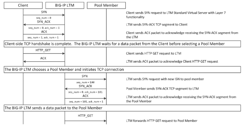 ถ้าเกิดว่า Standard Virtual Server ทำงานด้วย Layer7 function หรือการ Enable L7 Profile ไว้บน Virtual Server เช่น HTTP Profile ซึ่ง Client จะต้องส่ง Three-way TCP handshake และ data packet อย่างน้อย 1 packet มาก่อน และ F5 Load Balance จะเปิด Connection ด้วย Three-way TCP handshake และส่ง Packet ไปยัง Server เพื่อทำความเข้าใจมากขึ้น สามารถดูได้จากรูปด้านล่างครับ
