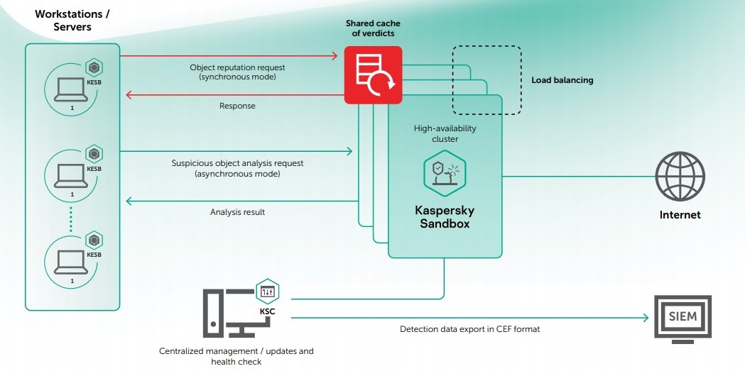 เมื่อตรวจพบภัยคุกคามขั้นสูงแล้วจะทำการส่งไฟล์ที่น่าสงสัยไปยัง Sandbox และ Sandbox จะดำเนินการตรวจสอบไฟล์โดยการสแกนไฟล์และดำเนินการในเครื่องเสมือนที่ติดตั้งเครื่องมือที่เลียนแบบสภาพแวดล้อมการทำงานทั่วไป (ระบบปฏิบัติการ/แอพพลิเคชั่นที่ติดตั้ง) เพื่อตรวจจับวัตถุประสงค์ร้ายของไฟล์ ทำการวิเคราะห์พฤติกรรมดำเนินและเก็บกระบวนการทำงาน หากไฟล์มีการกระทำที่เป็นภัย Sandbox จะจำเป็นมัลแวร์ ในระหว่างการวิเคราะห์ Sandbox จะตัดสินและกำหนดค่าให้กับไฟล์ เมื่อกระบวนการจำลองไฟล์เสร็จสมบูรณ์ ผลที่ได้จะถูกส่งแบบเรียลไทม์ไปยัง Center เพื่อช่วยให้โฮสต์อื่น ๆ ที่มี Kaspersky ติดตั้ง Endpoint Security for Business รับข้อมูลเดียวกัน เครื่องจะไม่สแกนและไม่ต้องวิเคราะห์ไฟล์เดียวกันอีกครั้ง วิธีการนี้ช่วยให้มั่นใจได้ว่าการประมวลผลของไฟล์ที่น่าสงสัยนั้นประหยัดเวลาและรวดเร็วลดการทำงานของเซิร์ฟเวอร์เพิ่มประสิทธิภาพของการตอบสนองต่อภัยคุกคามให้ดียิ่งขึ้น