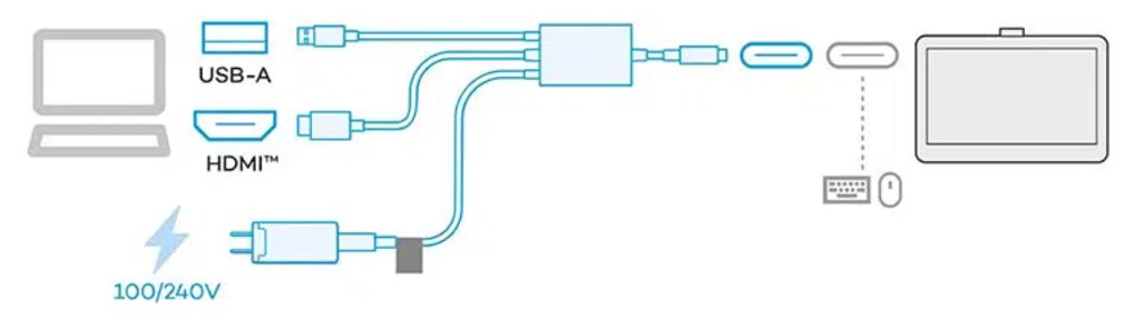 หากคอมพิวเตอร์รุ่นเก่าและไม่มี USB-C เลย Wacom ก็ได้ทำสายเคเบิล 3-in-1 ขึ้นมาเพื่อเชื่อมต่อกับพอร์ต HDMI ของคอมพิวเตอร์ของคุณสำหรับวิดีโอ พอร์ต USB (A) สำหรับอินพุตปากกา/สัมผัส และอะแดปเตอร์ไฟติดผนัง USB-C (ซึ่งเป็นเรื่องดีเพราะช่วยให้คุณมีตัวเลือกในการจ่ายไฟเพิ่มมากขึ้นด้วย)